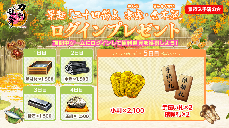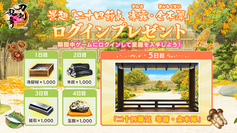 景趣「二十四節気 寒露・金木犀」ログインプレゼントを実施します。期間中ゲーム内の本丸を開くと最大5日(5回)プレゼントが受取箱に贈られます。