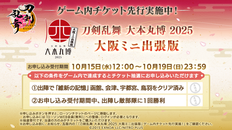 『刀剣乱舞ONLINE』10周年記念行事「刀剣乱舞 大本丸博 2025 大阪ミニ出張版」のゲーム内チケット先行をこれより実施いたします。