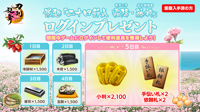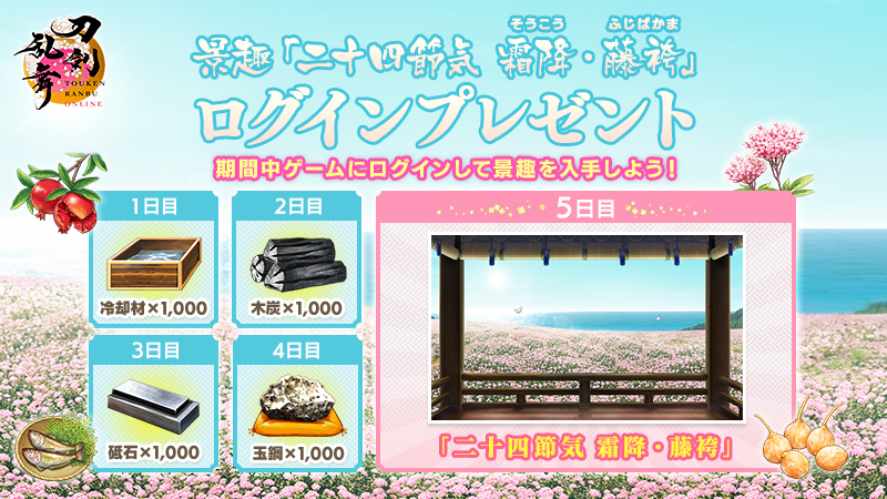 景趣「二十四節気 霜降・藤袴」ログインプレゼントを実施します。期間中ゲーム内の本丸を開くと最大5日(5回)プレゼントが受取箱に贈られます。