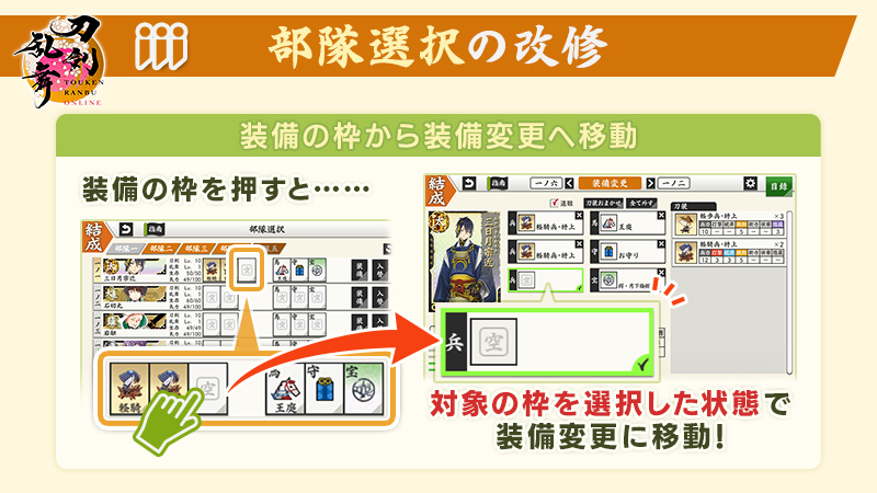 部隊選択にて、装備の枠を選択した際、対象の枠を選択した状態で装備変更へ移動するように改修しました。 ※詳細は、ゲーム内の瓦版「お知らせ」をご確認ください。
