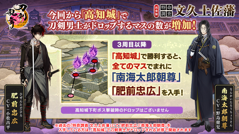 また、本催物より「高知城」で刀剣男士がドロップするマスの数が増加いたしました!