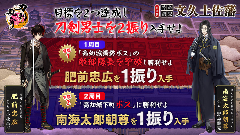 過去に開催された催物「特命調査 文久土佐藩」で「肥前忠広」「南海太郎朝尊」を獲得済みの場合、「難易度・難」が解放された状態で開始されます。