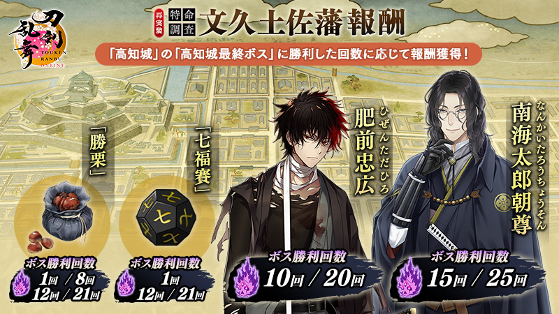 「高知城最終ボス」に勝利した回数に応じて獲得できる報酬には「肥前忠広」「南海太郎朝尊」が登場するほか、七福賽や勝栗も獲得できます。