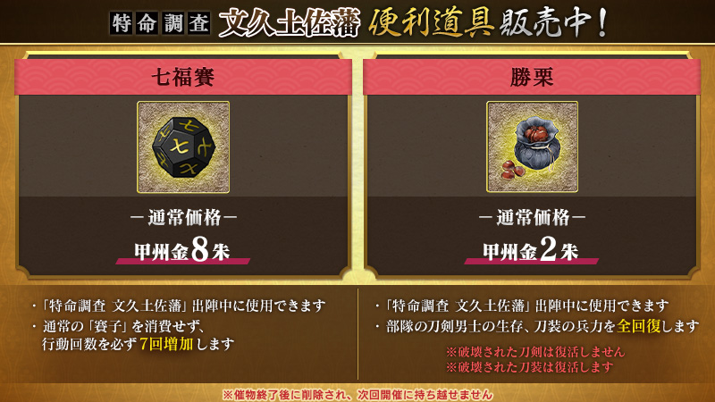 「特命調査 文久土佐藩」で使用できる専用便利道具を期間限定で万屋にて販売いたします。