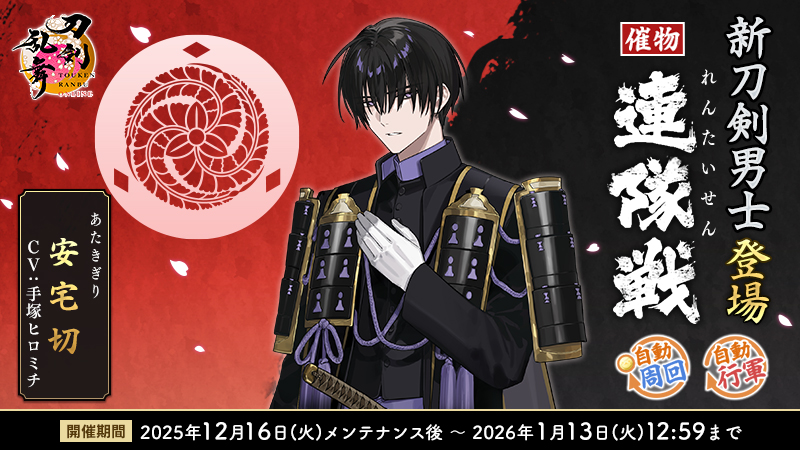 催物「連隊戦」を開催いたします。報酬に新刀剣男士「安宅切(あたきぎり)」が登場!また、「自動周回」機能を実装いたしました。
