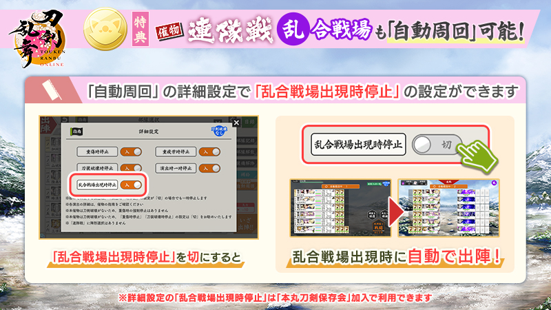 催物「連隊戦」では「自動周回」の詳細設定で、「乱合戦場出現時停止」の設定ができます。設定を「切」にすると、乱合戦場出現時に自動で出陣します。
