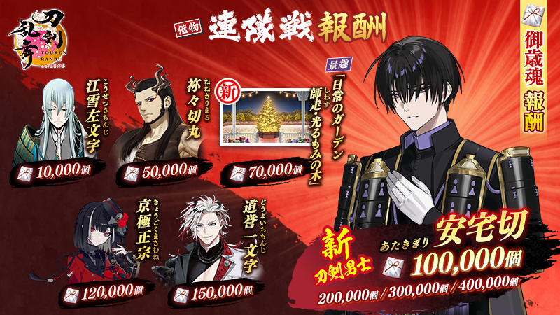 「御歳魂」を集めて獲得できる報酬には、新刀剣男士「安宅切(あたきぎり)」に加え「道誉一文字」「京極正宗」「祢々切丸」「江雪左文字」も登場するほか、景趣「日常のガーデン 師走・光るもみの木」も入手できます。