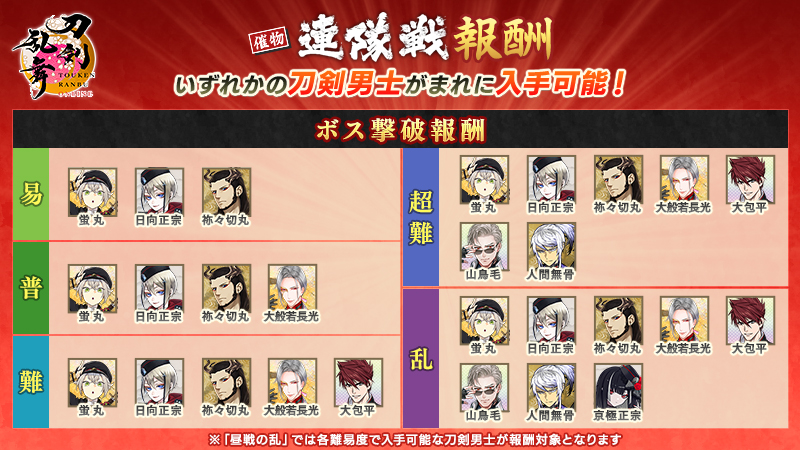 各難易度の催物合戦場のボスを撃破した際に、特定の刀剣男士をまれに入手できます。