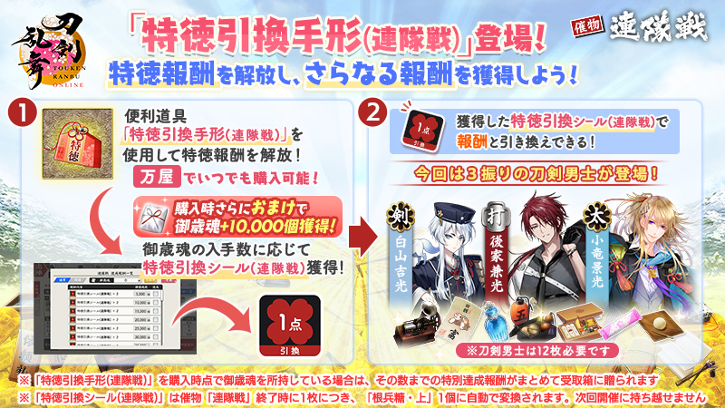 新たに「特徳引換手形(連隊戦)」を実装いたしました。「特徳引換手形(連隊戦)」を購入して特徳報酬を解放すると、御歳魂の入手数に応じて「特徳引換シール(連隊戦)」を獲得できます。「特徳引換シール(連隊戦)」は引換所(特徳)で刀剣男士などを入手できます。
