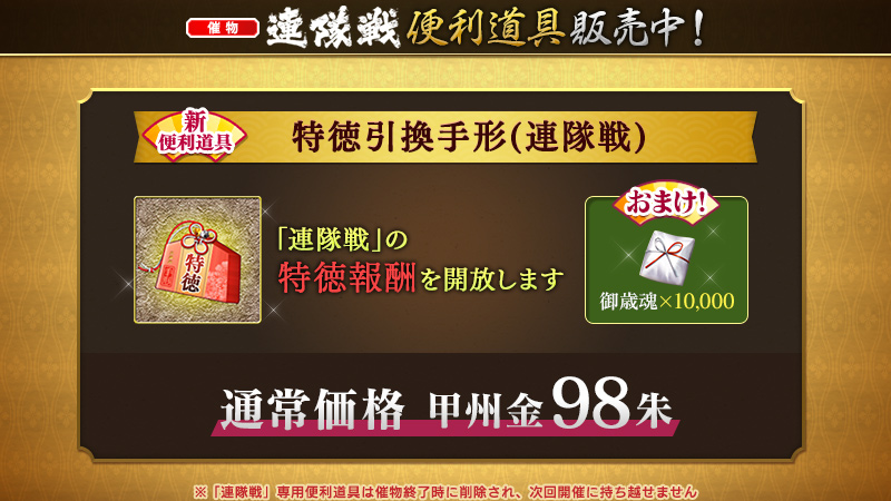 ※「特徳引換手形(連隊戦)」を購入した際に御歳魂を所持している場合は、その数までの特徳報酬がまとめて受取箱に贈られます。