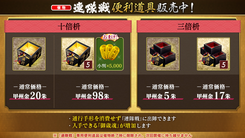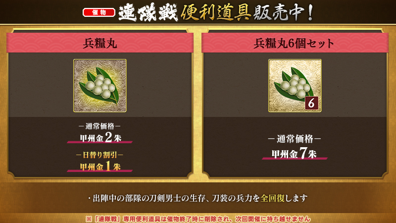 催物「連隊戦」で使用できる専用便利道具を期間限定で万屋にて販売いたします。