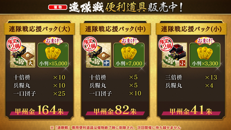 また、催物「連隊戦」で使用できる専用便利道具のお得なパックも期間限定で万屋にて販売いたします。